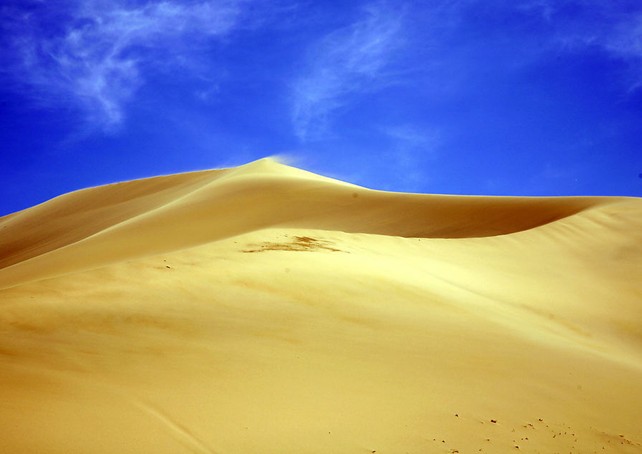巴里坤鳴沙山位于新疆巴里坤哈薩克自治縣境內,西距縣城60公里,四周被豐美碧綠的草場所包圍,猶如湛藍大海中的一座金色小島。鳴沙山形似一朵蘑菇,高約百米,沙丘陡峭,其下有水泉,左右兩側有河流通過。據說這里是唐代女將樊梨花西征遇難的地方,聽到的沙鳴,就是女兵們當時擂鼓助陣和沖殺鼓掌之聲。