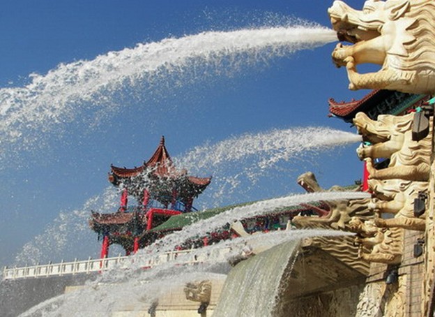 九龍?zhí)妒强死斠篮拥脑搭^所在,地處克拉瑪依河穿城風(fēng)景帶之首—東郊瀑布景區(qū)內(nèi)。該景區(qū)主要由高約8米的人工瀑布、瀑布下的巨潭和周圍大面積的綠化林帶草坪構(gòu)成。瀑布水源來自風(fēng)克干渠湍急的水流從中間的一條巨龍口中噴出,利用水的噴涌速度和自然重力形成寬約10米的巨大的瀑布,瀑布的兩邊分列的8條龍嘴也同時(shí)噴出水柱,構(gòu)成一副巨大的水廊。