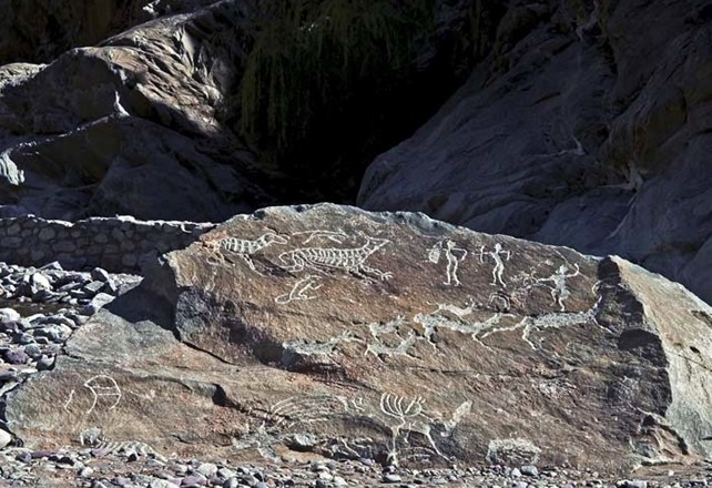 垂吉爾塔格山巖畫,位于托克遜縣城西北55公里處。在十幾、二十公里長的柯爾加依溝的山丘石壁或墜落的土黃色砂巖上,分布著數十幅栩栩如生、形態各異的古代巖畫。巖畫有放牧、狩獵和引水灌溉等圖案,以動物為主,有鹿、駱駝、豹、虎、狼、狗,最多的是大角羊。 畫中人物或行或立,或射箭或騎駱駝,他們頭戴大皮帽,腳穿長腰靴,腰部束帶,雄姿勃發。垂吉爾塔格山巖畫線條流暢,稀疏均勻,布局合理,鑿刻技藝高超,真實地反映了古代人生活放牧的情景,是新石器時代的作品。垂吉爾塔格山水系石刻圖距柯爾加依鎮西北5公里柯爾加依溝西岸的土黃色砂巖上,有一幅當今世界上最早的水系石刻圖,它就是垂吉爾塔格山水系石刻圖。