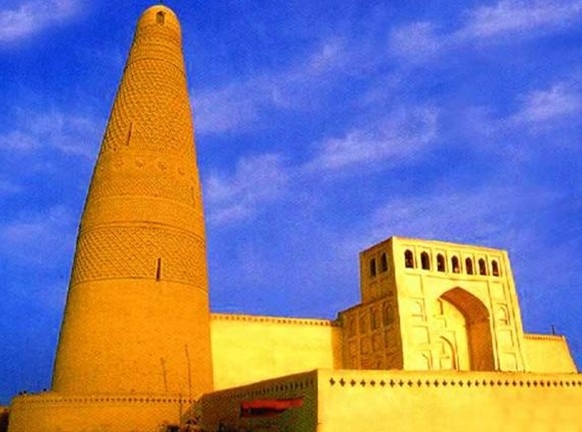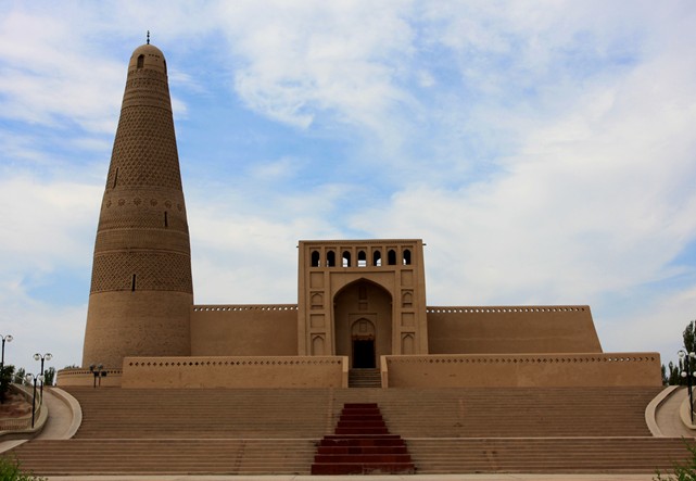 與寺緊挨著的蘇公塔,整個磚砌,由臺上量起高44米,頂上為圓形,直徑2.8米,下徑擴大甚多,為11米。塔下為高臺,版權所有山東聊城聊之旅國際旅行社有限公司,轉載必究!高臺旁邊是公路,公路又低于高臺約10余米,所以在寺外仰視,高塔凌云。同時塔身上又滿布花紋,如纓絡、錦繡等。只此一塔,便使古城增添了無限的生氣。塔形渾圓,全部磚砌,中有螺旋形賠道,盤旋直達塔頂。這樣壯麗奇偉的大磚塔,其砌造技藝是我國清真寺建筑中一項偉大貢獻,也是勤勞的維吾爾族人民表現在建筑技藝上的一大成功。