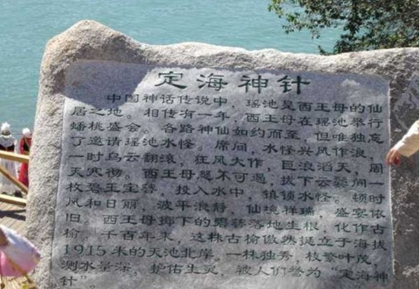 定海神針是天池周圍方圓幾公里內唯一的一棵榆樹,也是海拔最高的一棵樹。在天池湖岸邊有一棵郁郁蔥蔥,枝繁葉茂,傲然獨立的大榆樹,這就是天池八景之一的“定海神針”。神話傳說:相傳當年王母娘娘開蟠桃盛會,廣邀各路神仙,唯獨忘了邀請瑤池水怪。席間水怪興風作浪,王母娘娘怒不可遏,拔下頭上的一枚碧玉簪,擲入水中降服水怪。