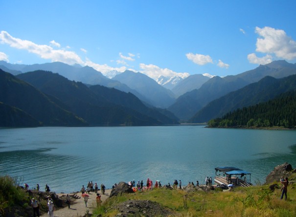 天山天池位于博格達峰北坡,海拔1900多米,系高山融雪匯集而成。傳說王母娘娘曾在此沐浴,故稱瑤池。天池風景區以天池為中心,融森林、草原、雪山、人文景觀為一體,形成別具一格的風光特色。天池共有三處水面,除主湖外,還有東側的東小天池,古名黑龍潭。潭下為百丈懸崖,有瀑布飛流直下,恰似一道長虹依天而降,煞是壯觀。
