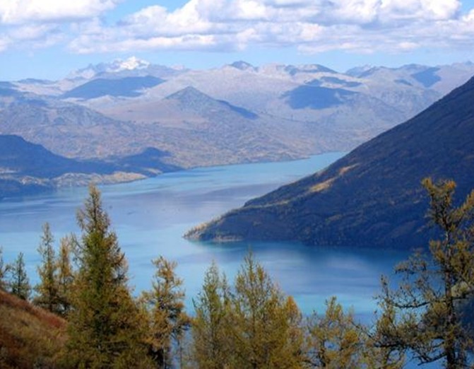 湖面呈北西向狹長的彎月狀展布,長約13km,寬1~3km,面積約9.3km2,最大湖深7.5m,平均湖深2.0m,容積約4.0×107m3。由8個小湖泊相連組成,湖水為無色透明的淡水,礦化度1~2g/L,PH值8。湖水夏季水溫17℃,冬季結(jié)冰,最厚處40cm。湖區(qū)年平均氣溫9.9℃,1月平均氣溫-9.0℃,極端低溫-27.6°C,7月平均氣溫 23.8℃,極端高溫40.7℃,年降水量60.8mm,蒸發(fā)量1896.5mm。主導(dǎo)風(fēng)向西北,最大風(fēng)速20m/s。每年12月初湖水開始結(jié)冰,解凍期為翌年3月中旬。5月初至 10月底為旅游季節(jié)。