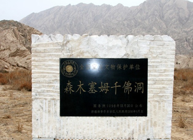 森木塞姆千佛洞屬全國重點(diǎn)文物保護(hù)單位,位于中國西北部新疆維吾爾自治區(qū)的庫車縣,是一處晉代至宋代(公元4~10世紀(jì))的佛教石窟群遺址。森木塞姆千佛洞主要分布于卻勒塔格山口直徑約800米范圍內(nèi)的山崖上。石窟大部分已經(jīng)遭到破壞,目前保存較為完整的有57座。洞窟分布在馬蹄形的山谷里,按地理位置可分為東、南、西、北、中五個(gè)區(qū),現(xiàn)有編號洞窟57個(gè)。中區(qū)中央為一地面寺院遺址。洞窟的形制多種多樣,保存了古龜茲王國完整的洞窟和壁畫的實(shí)物資料。壁畫題材以因緣、佛教故事為主,人物畫多以土紅色勾畫輪廓,暈染法表現(xiàn)明暗與立體,用色艷麗。晚期洞窟壁畫則出現(xiàn)了漢族及回鶻的畫風(fēng)。