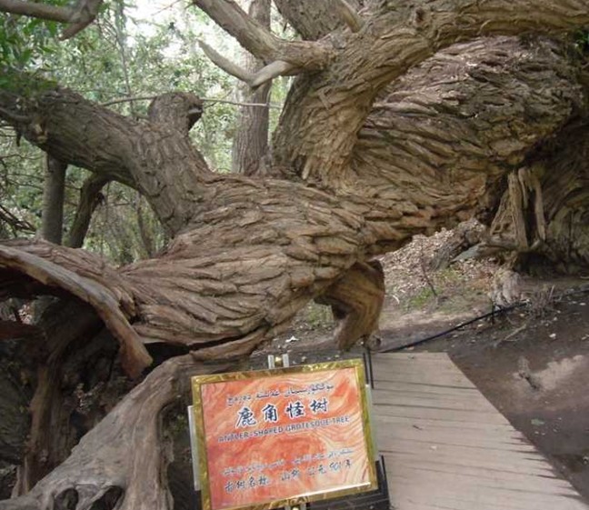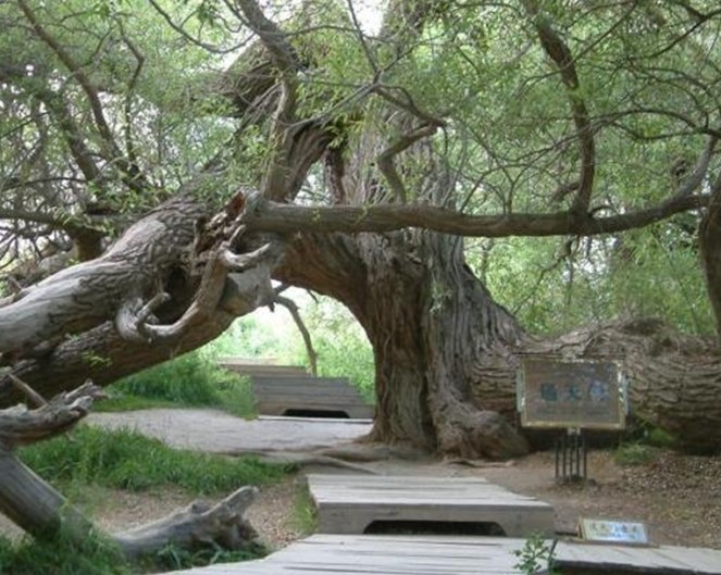 神木園其實是一處古墓地,它的原始名字叫庫爾米什阿塔木麻扎。在溫宿縣地圖上西北邊的一條公路兜住的那三個小圓點,就是新疆聞名遐邇的天山神木園的標注。溫宿縣志•卷二十七•第五章第四節古墓葬中對此記載如下:庫爾米什阿塔木麻扎位于薩瓦甫牧場場部東北10.7千米。地理坐標:東經79°42′26″,北緯41°35′32″。面積680畝,海拔1700米,尚存古墓數十座。相傳公元11世紀,沙特阿拉伯的一名叫蘇力塔庫爾米什賽依德的伊斯蘭教阿訇,帶領兩千名教徒,經印度到中國傳教,受到當地人的抵制并發生沖突。敗退至此地時,大部分教徒戰死,蘇也陣亡,便埋葬在這里,形成了一個占地頗大的麻扎。其中呈圓形的最大的一個是蘇的墳墓,雖年久失修,確仍保持著穆斯林古老墓式。麻扎四周為戈壁荒丘,內卻以草綠、樹怪、泉多而聞名遐邇。該麻扎高出地面50米,滿山遍野長滿了綠草,山地像披上了一張綠色的地氈。草地里有10余處泉頭,泉水淙淙,從草地穿行而過,樹形千姿百態,有的似神龍游動,屈折盤旋,貼地而伸:有的樹高達96。23米;有的樹枝與根部相連,分不出那是枝,哪是樹根。很多樹都是百年以上的老樹,版權所有山東聊城聊之旅國際旅行社有限公司,轉載必究!有的老樹倒地后又從根部發出新枝,長成參天大樹。庫爾米什阿塔木麻扎,既是穆斯林朝拜圣地,又是風景勝地,每年到這里朝拜、旅游者達萬余人次。為保護這一勝地,1986年縣財政拔款4萬元,群眾捐款十多萬元,對麻扎清真寺進行了修繕,并建筑了磚圍墻和架設了鐵刺圍欄。1989年11月,阿克蘇地區文物管理所普查隊來此地考查,被定為縣級文物保護單位,縣有關單位派有專人管理。麻扎東南20米處有一古墓群,計十余座,尚未發掘考察。這是1993年7月出版的溫宿縣志記載。從志書考證,神木園曾是一片處女地。公元11世紀,蘇力塔庫爾米什及其2000名教徒傳教殉職葬于此地后,當地人以庫爾米什阿塔木麻扎為此地命名。如今那個古老的命名也只能從志書中去搜尋考證了。
