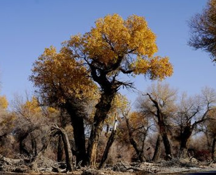 胡楊是第三紀殘余的古老樹種。胡楊生長期漫長,由于風沙和干旱的影響,很多胡楊樹造型奇特、詭異,有“活三千年不死,死三千年不倒,倒三千年不朽”的說法。全世界的胡楊絕大部分生長在中國,而中國百分之九十以上的胡楊林又生長在新疆塔里木河流域。 胡楊,維吾爾語叫“托克拉克”,意為“最美麗的樹”。由于它頑強的生命力,以及驚人的抗干旱、御風沙、耐鹽堿的能力,人們又叫它“沙漠英雄樹”。胡楊,還有紅柳、梭梭、沙棗等沙漠植物,它們的一生是一部啟示錄——有關生命與死亡、大漠首位與絕處逢生的啟示錄。