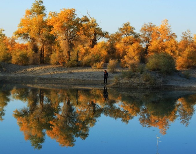 曠野上隨處可見輪臺油田高聳藍天的井架、排列齊整的鉆機和車隊以及井口噴射的朵朵烈焰,使昔日覺寂的荒原,充滿活力和生機。該公園現建有木頭賓館、磚砌的四合院接待站和食堂,可解決旅客的食宿。公園接待站后院高聳著一座二三十米高的了望鐵塔,登上塔頂,但見蔚藍的塔里木河蜿蜒曲折,散成眾多的汊流,汊流間布滿胡楊林。胡楊林海,順著塔里木河一直伸向茫茫天際,好不壯觀!森林公園色彩絢麗多變,綠樹、碧水、藍天,猶如一幅濃重的水墨畫。秋初黃綠相間,深秋一片金黃。公園中建有水榭、湖心亭,備有游船、汽艇可供開展巡河觀光。這里的河汊全長7千米,開始段呈長圓開如湖蕩,水中建有湖心亭,各種水鳥珍禽集隊飛翔鳴啼在湖面和森林中,湖中樹木倒影清晰,環境靜謐,空氣清新,漫步湖濱,令人心曠神怡;河汊中間段水面寬闊,汪洋一片,水波蕩漾,水中到處布滿奇開怪狀的枯樹與樹樁,船行其間猶如穿梭在梁山泊的水寨間,別有情趣,河汊末端水道收縮變窄,形成條條港汊,水流紋絲不動,水平如鏡,河汊兩邊的胡楊林連同藍天白云倒映水中,其影像比明鏡中的影子還要清晰逼真,令游人叫絕;河汊末端是蘆葦蕩和胡楊紅柳沙丘群,潔白的葦花蕩和胡楊紅柳沙丘群,潔白的葦花在逆光透射下發出誘人的銀白色光芒;牛、羊群悠閑地覓食在紅柳沙包中。登上沙丘頂,向南望,胡楊林一眼望不到邊;向北遠眺,沙漠油井噴射的火焰映紅了藍天。這如詩如畫的美景迷倒了無數的游人,令人流連忘返,特別是那些攝影愛好者和畫家,在這里一住就是一周甚至半月。