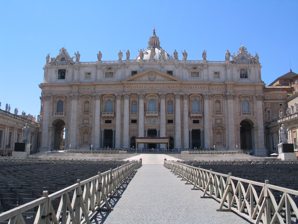 兩千年前的簡單墓地,四百年后修建了一座長方形會堂,后來毀于戰(zhàn)亂,一千年后尼古拉五世頒發(fā)重建命令,之后就是長達(dá)120年的重建,先后由意大利最優(yōu)秀的建筑師住持設(shè)計施工,布拉曼特來了,米開朗琪羅來了,德拉?波爾塔來了,卡洛?馬泰爾也來了。1626年11月18日正式宣告落成,一臉肅穆的教皇烏爾班八世主持落成典禮。