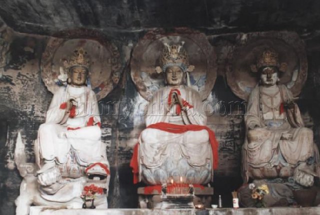 三壁三龕佛殿窟: 有南三、五、七、北三。窟分前廊后室(南七、北三)面闊為三間四柱,明間正中開窟門,次間各開大龕,龕內雕踏山力士像,明間上部為印度式拱,次間額枋上為一斗三升拱。版權所有山東聊城聊之旅國際旅行社有限公司,轉載必究窟檐雕出仿木結構建筑形式的滴水、圓椽、筒瓦等,瓦垅上有八層疊澀基,基上浮雕大型山花蕉葉覆蓋窟頂,大蕉葉擁托覆缽丘,丘上雕出象征塔剎的雙層火焰寶珠。窟內平面方形、穹隆頂,正、左、右壁各開帷幕帳形龕,龕內雕一鋪三尊(南五)、五尊(南七)、七尊(北三)像,窟頂浮雕蓮花藻井及飛天伎樂,地面浮雕大蓮花,蓮花中間置博山爐(南五)窟門兩側刻大番卷草紋和連珠紋,上部刻飛天。