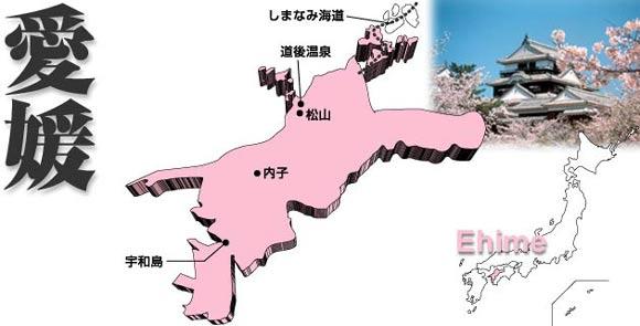 愛媛縣古稱伊予,位于四國西北部。北部偏東,南北走向細長。面積約5677平方公里,居全國第25位。人口約143萬,居全國第27位。愛媛縣氣候溫暖,得天獨厚。由于坡地較多,雨水較少,適宜于果樹園藝和畜牧業的發展。下轄11個市9町?,F任知事中村時廣,2010年12月當選。