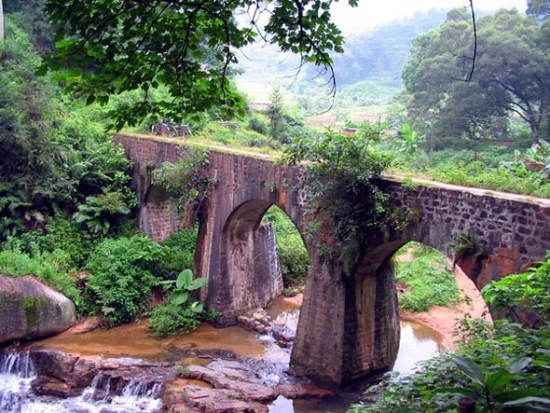 由“一步登天”往上攀登,約500米,可見八字石懸崖峭壁險(xiǎn)路之間,一橋飛架,狀若彩虹,又叫虹橋。登臨橋上。俯視山下,宛若置身云端。橋旁有涓涓細(xì)流自崖壁間流出,匯成一眼清泉,它與乳泉其實(shí)同出一源。