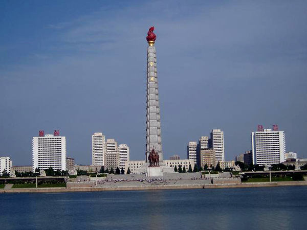 主體思想塔正面,清澈的大同江水潺潺流過(guò),江水中有兩個(gè)大型噴泉,水柱達(dá)150米高,在噴泉的襯托下,主體思想塔更加壯麗、雄偉。可以乘坐高速電梯上至主體思想塔的150米處,俯瞰平壤全景。