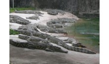 在白藤湖內尖峰橋湖心路口即可望到鱷魚島那金碧輝煌,巍峨壯麗的泰式門樓,門前寬廣的停車場可一次性停放上百輛大巴,進入大門后,有一個十分醒目、高達4米的大型鱷魚雕像——“鱷魚一家”吸收不少游客紛紛在此攝影留念,離雕像百米處,十多個鱷魚池座落在鮮花叢中、綠茵地上、池中養有我們祖先稱為“噴火龍”、“鮫龍”的楊子鱷、泰國灣鱷、馬來鱷、雜交鱷等四個品種,大小近千條,最小的有剛出殼的幼鱷,體型最大的有4米多長,重達千斤。
