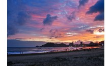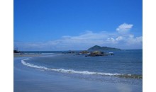 大角灣風景名勝區位于廣東陽江市海陵島西南端,三面群峰拱護,面向浩瀚南海,沙灘長2.5公里,寬100米,因狀似牛角,故名“大角灣”。這里地處南亞熱帶,全年日照時間長,年平均氣溫22.8℃,水溫23.5℃,降雨量1816毫米,年晴天數310天,四季氣侯宜人,素以陽光燦爛明媚,沙質均勻松軟,海水清澈純凈,空氣清新純潔而著稱,各類質素均達國際一類(級)標準,又因沙灘寬闊平坦。