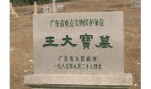 王大寶墓位于潮安縣歸湖鎮神前村的神前山,其地俗稱沉江月,占地約4畝,筑于宋乾道六年(1170)。墓地向西,墓碑高約2.3米,楷書陰刻“宋禮部尚書大寶王公墓”。墓前排列著南宋大型石雕群,計文武翁仲、石獅、石羊、石筍、石望柱、石馬等14件,石雕線條粗擴,工藝簡練古樸,反映了南宋的雕刻藝術水平和風格,是廣東省現存為數不多的大型宋代石雕。1989年王大寶墓被列為廣東省重點文物保護單位。