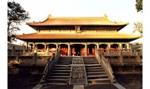 大成殿是孔廟的正殿,也是孔廟的核心。唐代時稱文宣王殿,共有五間。宋天禧五年(公元 102年)大修時,移今址并擴為七間。宋崇寧三年(公元1104年)徽宗趙佶取《孟子》:“孔子之謂集大成”語義,下詔更名為“大成殿”,清雍正二年(公元 1724年)重建,九脊重檐,黃瓦覆頂,雕梁畫棟,八斗藻井飾以金龍和璽彩圖,雙重飛檐正中豎匾上刻清雍正皇帝御書“大成殿”三個貼金大字。
