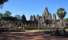 巴戎廟 位于柬埔寨暹粒,吳哥城內最為出名的要數巴戎廟中的佛塔了,巴戎廟位于吳哥城的中心位置,巴戎廟是由一組共49座小寶塔圍繞中央尖塔構成的建筑群,這些塔在佛語里又被稱做浮屠,每一座塔的四面都雕刻著巨大的佛面,也正因為如此,這些塔又被稱作佛面塔,上面的佛被稱為四面佛。