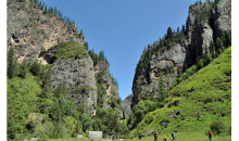 從卓尼縣城沿洮河向東,經(jīng)“石媳婦”(矗立于洮河岸邊的一座石峰)、博峪楊土司衙門遺址,便到大峪溝口的多壩村,向南沿林區(qū)公路進(jìn)大峪溝4公里,就到大峪河上的云江峽。云江峽猶如被縮小了的九巔峽,西壁高約百米,東壁高30~50米,峽長500多米,其間石峰嵯峨,石門如屏,蒼松翠竹葳蕤,河水清冽碧綠,鳥鳴枝頭,魚翔淺底,可謂一幅絕妙的圖畫。