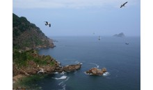 老鐵山位于遼東半島的尖端,系千山山脈的余脈,她與山東半島隔海相望,其間的老鐵山水道是我國(guó)最兇險(xiǎn)、最涌急的水道。老鐵山燈塔就建在老鐵山角上,海拔86.7米,是清廷海關(guān)當(dāng)局于1893年請(qǐng)法國(guó)人制造,由英國(guó)人修筑的,雖歷經(jīng)了1894年中日甲午海戰(zhàn)和1904年日俄戰(zhàn)爭(zhēng),仍保存完好,至今仍為過(guò)往船只導(dǎo)航。在老鐵山燈塔下方,是險(xiǎn)峻陡峭險(xiǎn)的懸崖峭壁,它與山東蓬萊的理論對(duì)角線即為黃、渤海兩海分界線。黃、渤兩海的浪潮,由海角兩邊涌來(lái),交匯在這里,由于海底地溝運(yùn)動(dòng)和兩海各自不同水色(黃海海水較藍(lán)、渤海海水略黃)的作用,形成一道"涇渭分明"的水流,即黃渤海分界線。